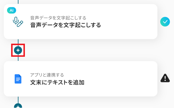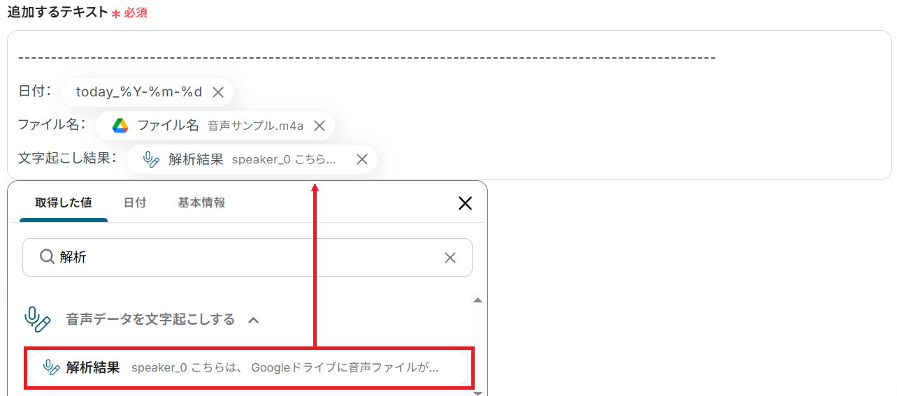 要約オペレーションで取得した値を、ステップ7の「追加するテキスト」に加えると、文字起こしそのものだけでなく要約も追記することができます。