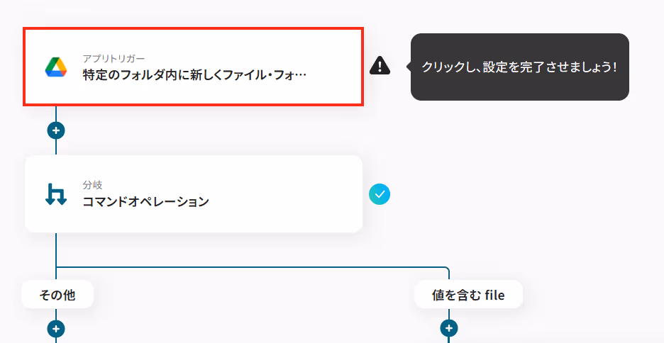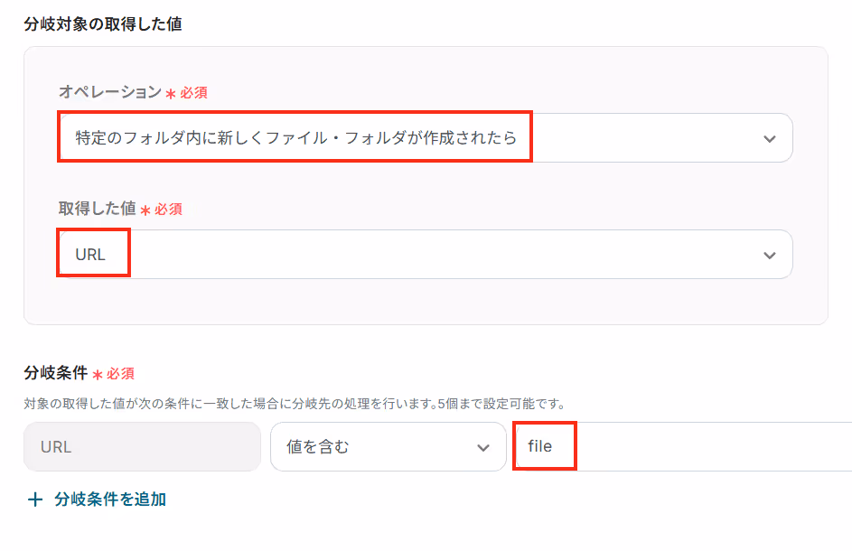 オペレーションに「特定のフォルダ内に新しくファイル・フォルダが作成されたら」、取得した値に検知したい項目を設定します。「分岐条件」は、分岐先の処理を行う条件を設定します。
