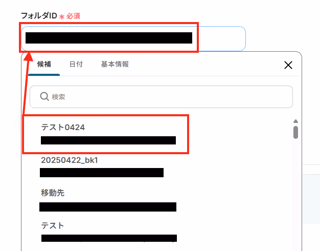 4.「フォルダID」は、入力欄をクリックして表示される候補から選択してください。