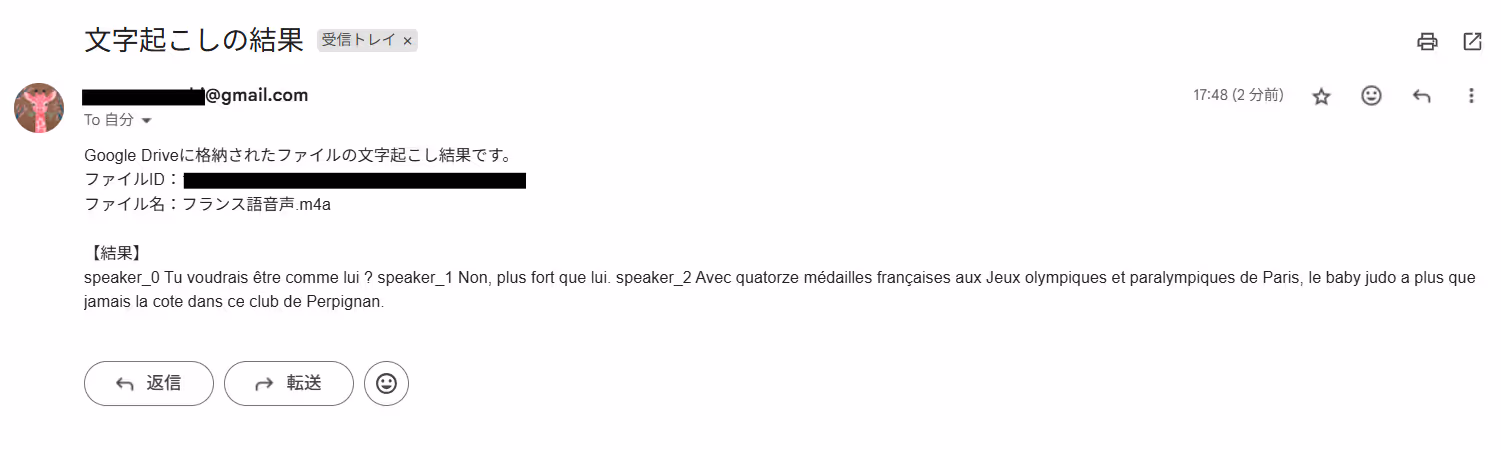 <span class="mark-yellow">Google Driveにアップロードされたフランス語のスピーチの音声ファイルを自動でテキスト化し、Gmailなどのメールツールにその内容を送信する</span>ことができます。