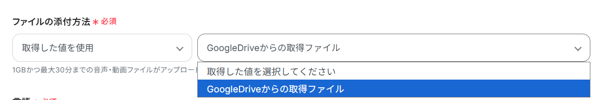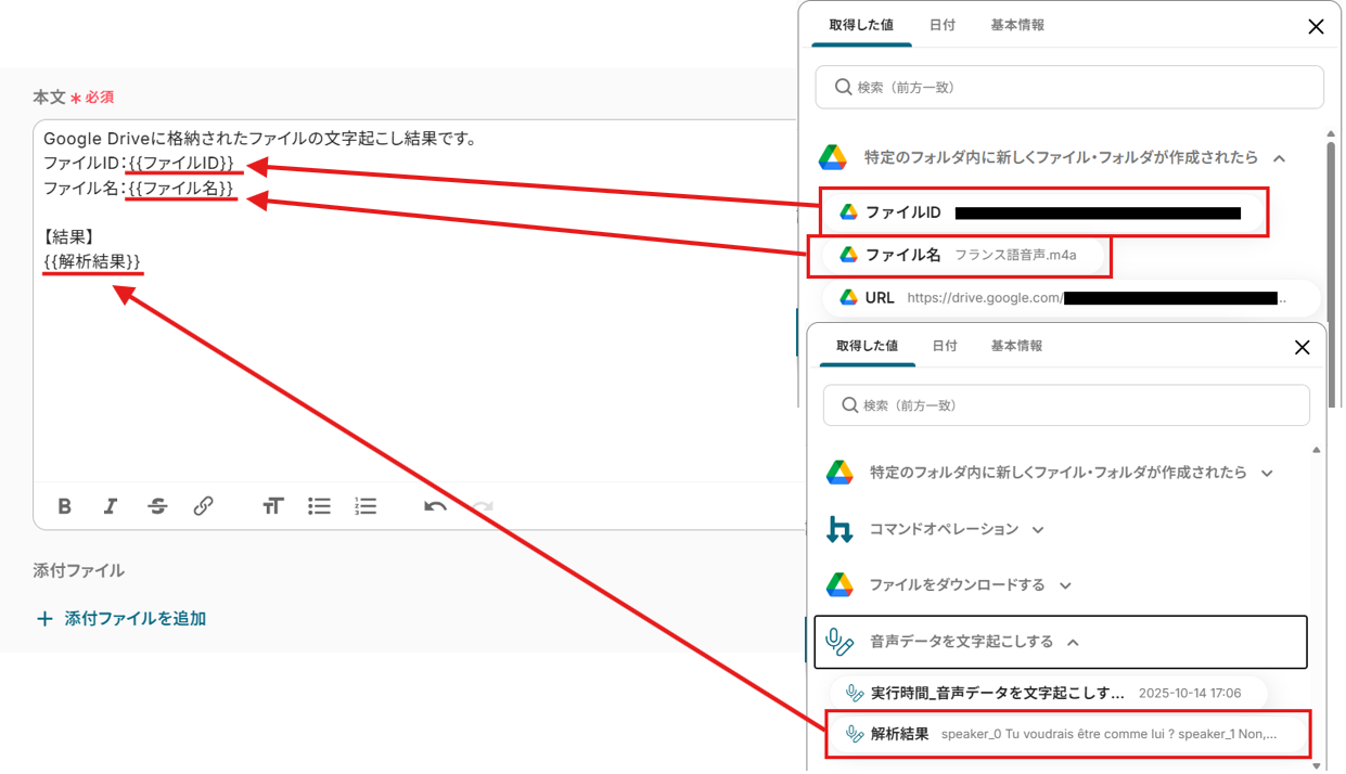 2.API接続設定を行います。 「ファイルID」は、入力欄をクリックして表示される取得した値から、文字起こしを行う音声ファイルを選択 してください。 取得した値を活用することで固定値ではなく、トリガーが実行されるたびに最新の情報が反映できます。