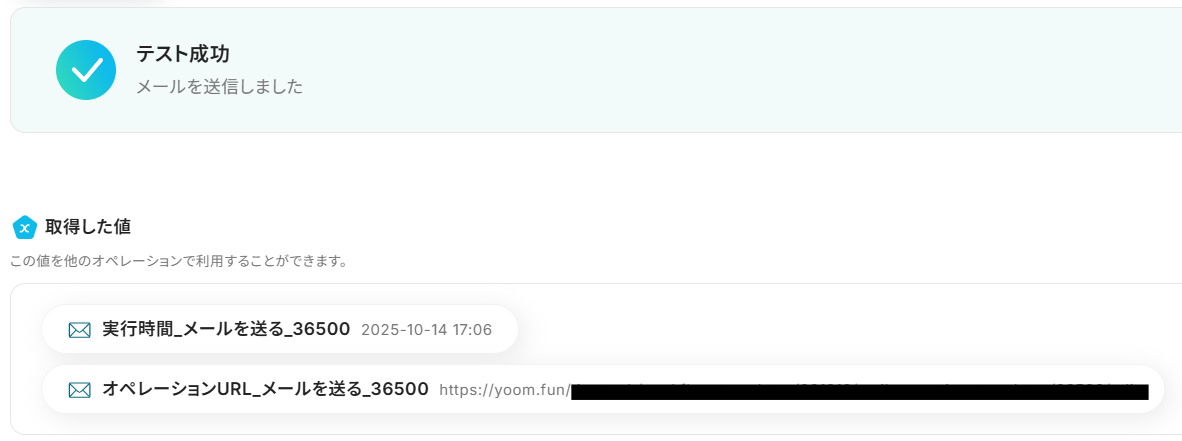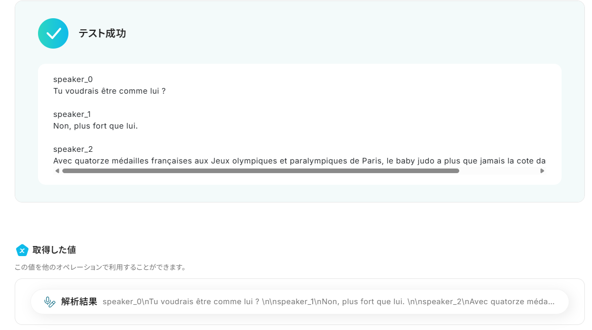 入力が完了したら「テスト」を実行し、正しく音声が文字起こしされていることを確認しましょう。 ここで取得した値を次のステップで活用し、メールで送信します。