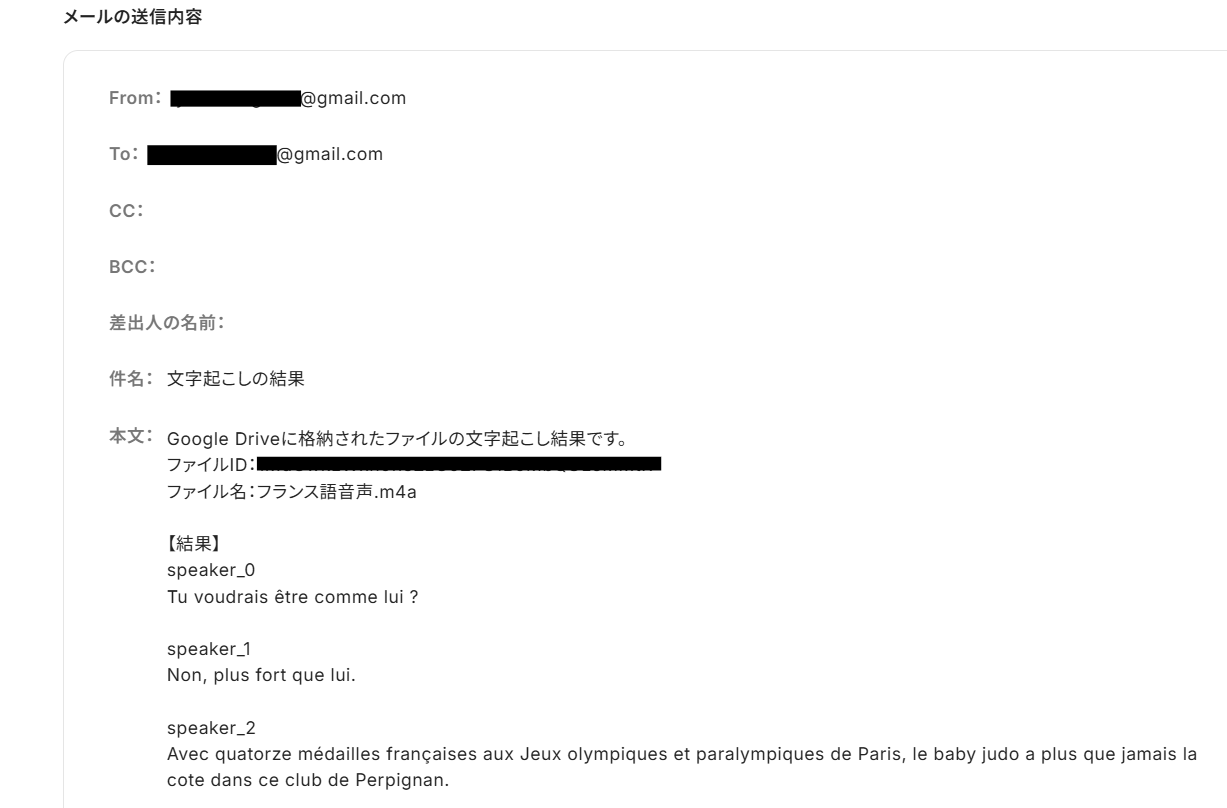 Google Driveに格納されたフランス語音声をテキスト化し、Gmailで送信する