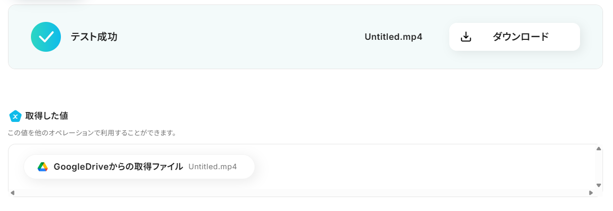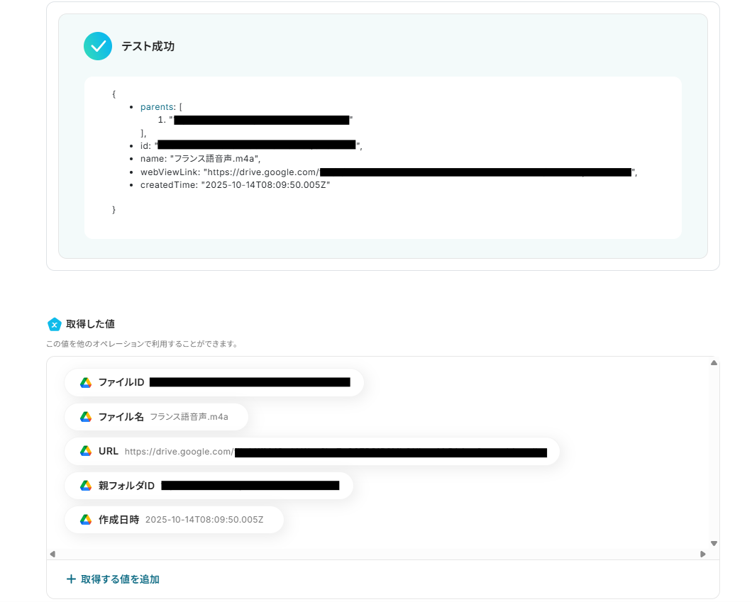 5.入力を終えたら「テスト」をクリックし、「取得した値」にGoogle Driveのデータが抽出されていることを確認してください。 確認したら「保存する」をクリックしましょう。取得した値は、後続の設定で活用できます!