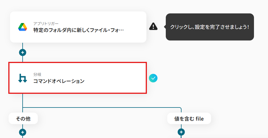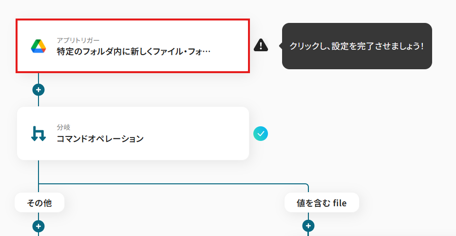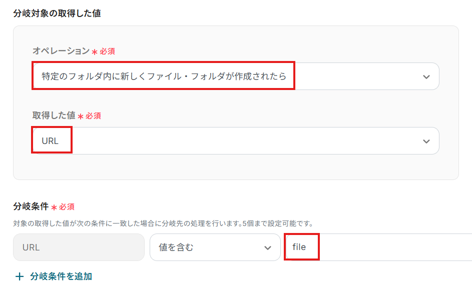オペレーションに「特定のフォルダ内に新しくファイル・フォルダが作成されたら」、取得した値に検知したい項目を設定します。「分岐条件」は、分岐先の処理を行う条件を設定します。 今回は、URLにfileというワードが含まれている場合のみ後続の処理へ進む設定になっています。