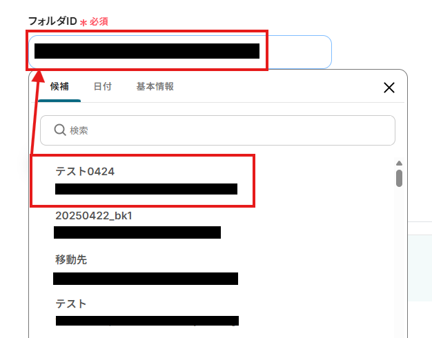4.「フォルダID」は、入力欄をクリックして表示される候補から選択してください。 候補は、連携しているアカウントに紐づいて表示されます。先ほど音声ファイルをアップロードしたフォルダを選択しましょう。
