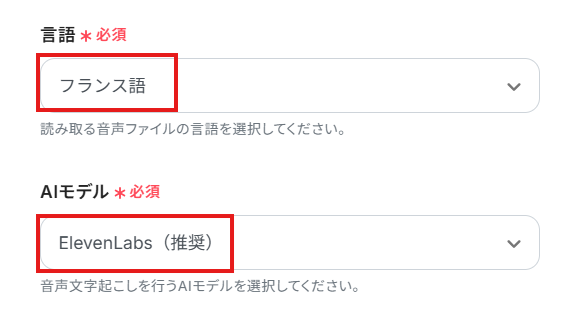 「言語」「AIモデル」は、プルダウンから以下画像のように選択してください。 ※AIモデルは、なるべく推奨モデルを選択してください。