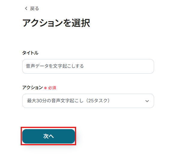 2.このフローで使用する「文字起こし」のアクションは、音声ファイルの長さによりタスク数 が変わります。 アクション選択設定は、テンプレートを使用しているためデフォルトで完了していますが、タスク数には注意が必要です。