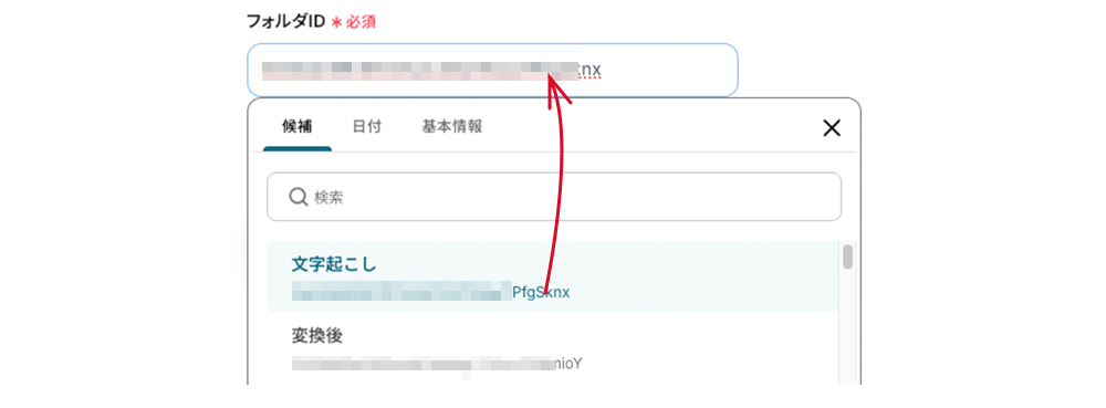 フォルダID 事前に、インタビューの音声データ(MP4)を格納するフォルダを作成しておきます。編集欄をクリックするとプルダウンメニューが表示されます。作成しておいたフォルダを選択すると、IDが引用されます。