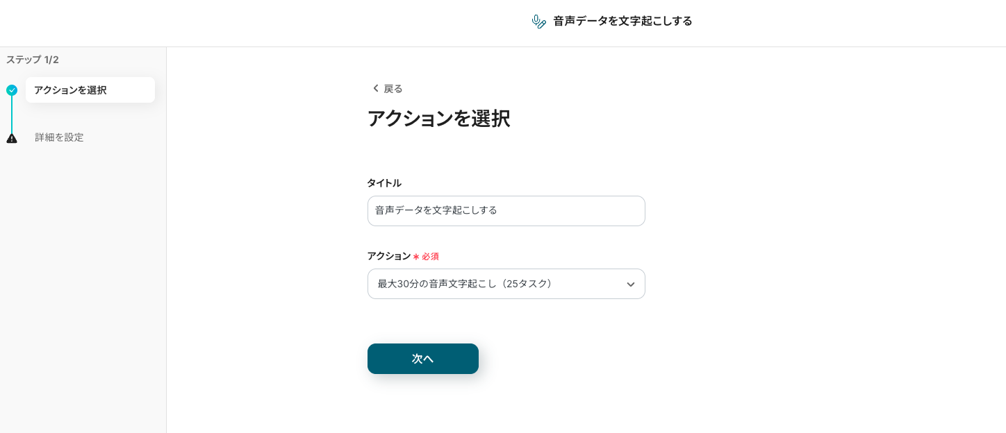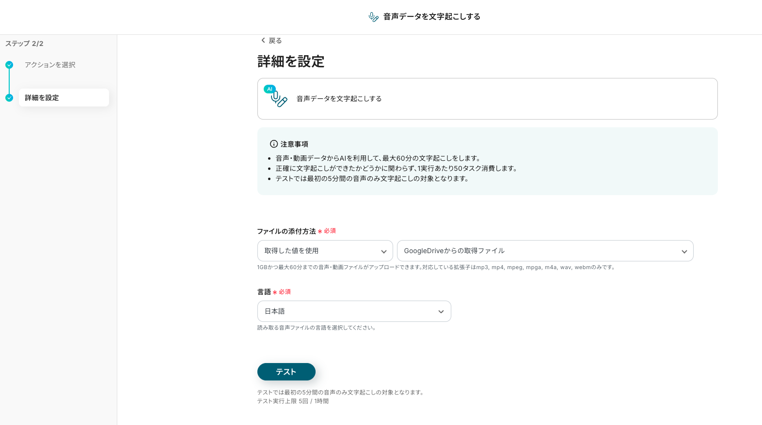文字起こしアクションの設定(処理対象のファイル、文字起こし言語の指定など)