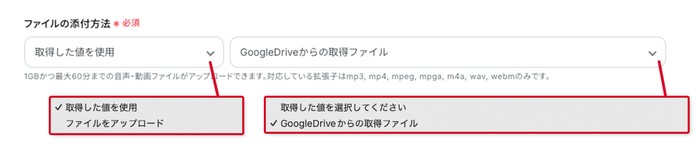 ファイルの添付方法 前の操作で取得したダウンロードデータを使用するため、プルダウンから「取得した値を使用」「ダウンロードファイル」を選択してください。