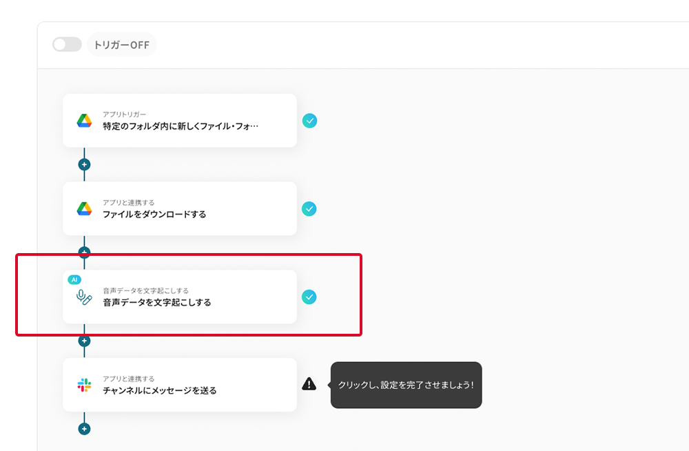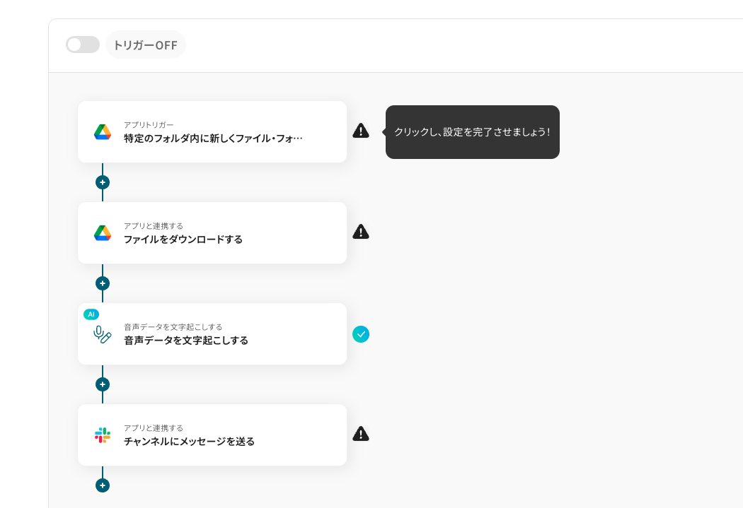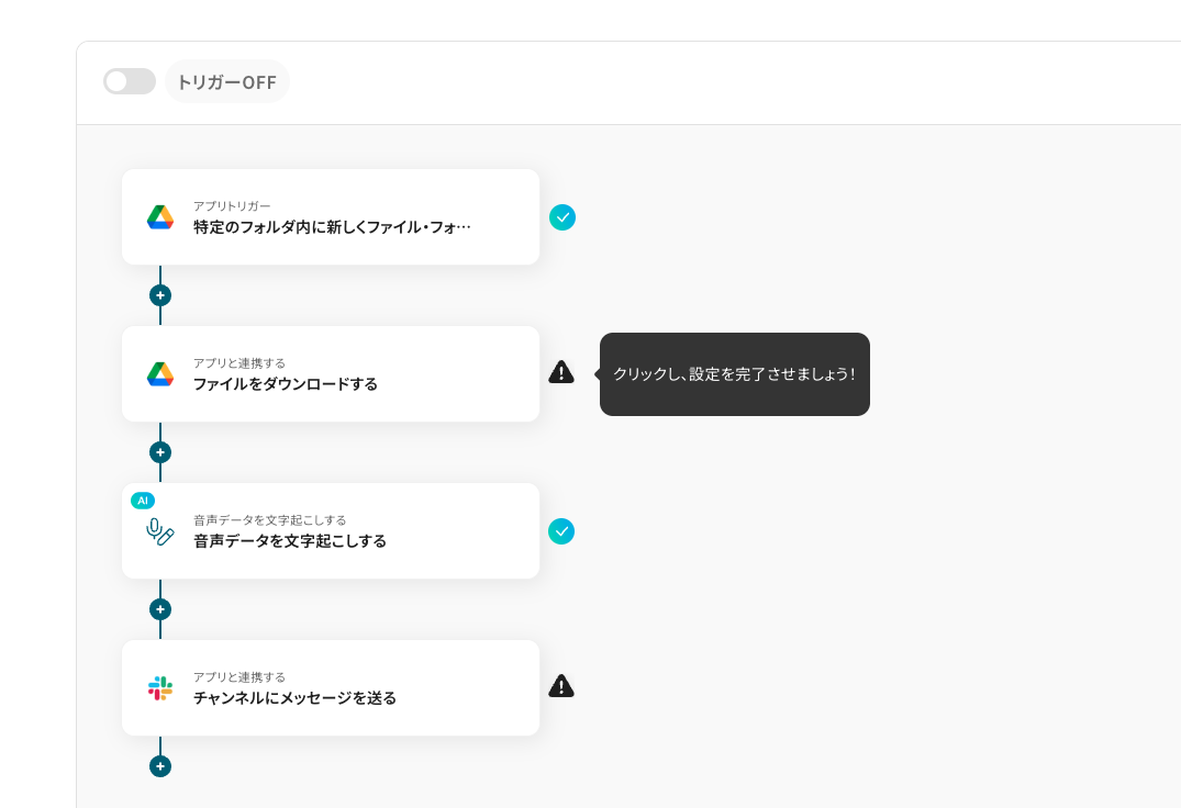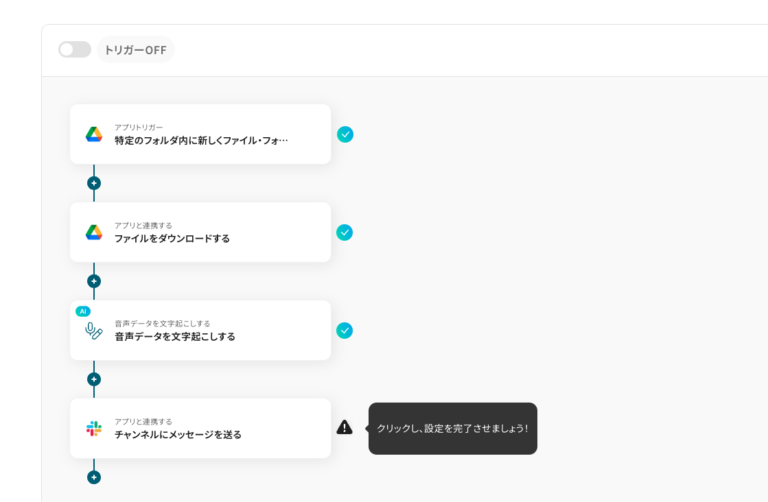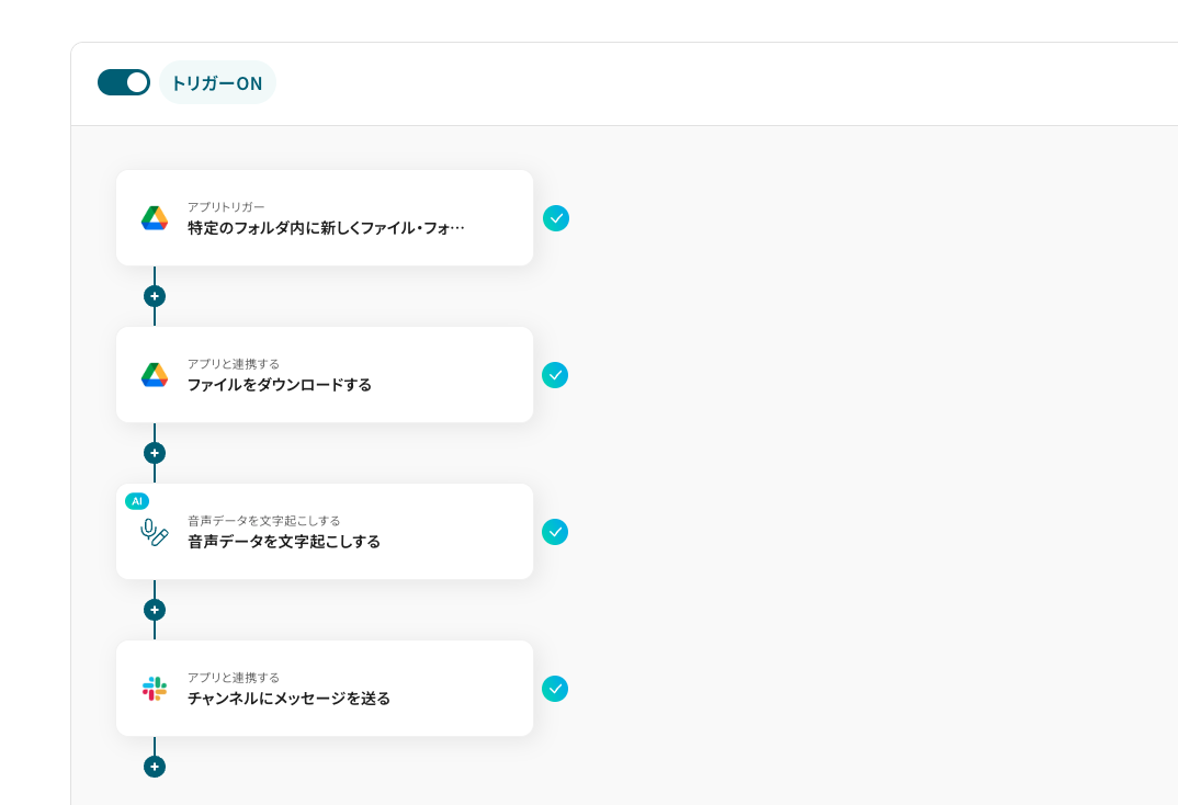 それではここから代表的な例として、Google Driveの指定フォルダにインタビューの音声ファイルがアップロードされた際に、そのファイルを自動で文字起こしし、結果をSlackに通知するフローを解説していきます!