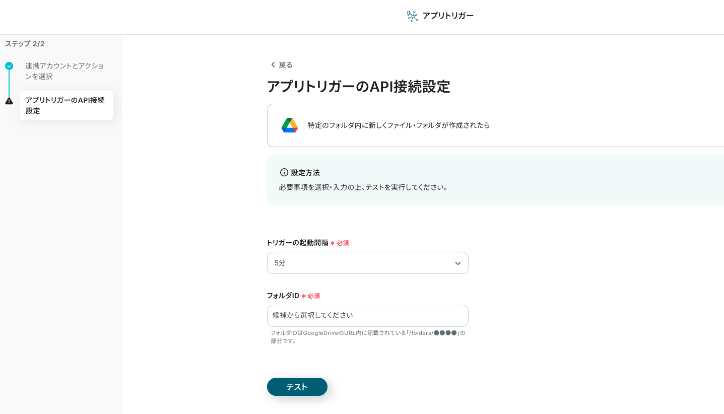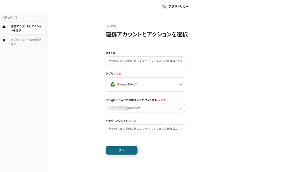 ステップ3:アプリトリガー「特定のフォルダに新しくファイル・フォルダがアップロードされたら」