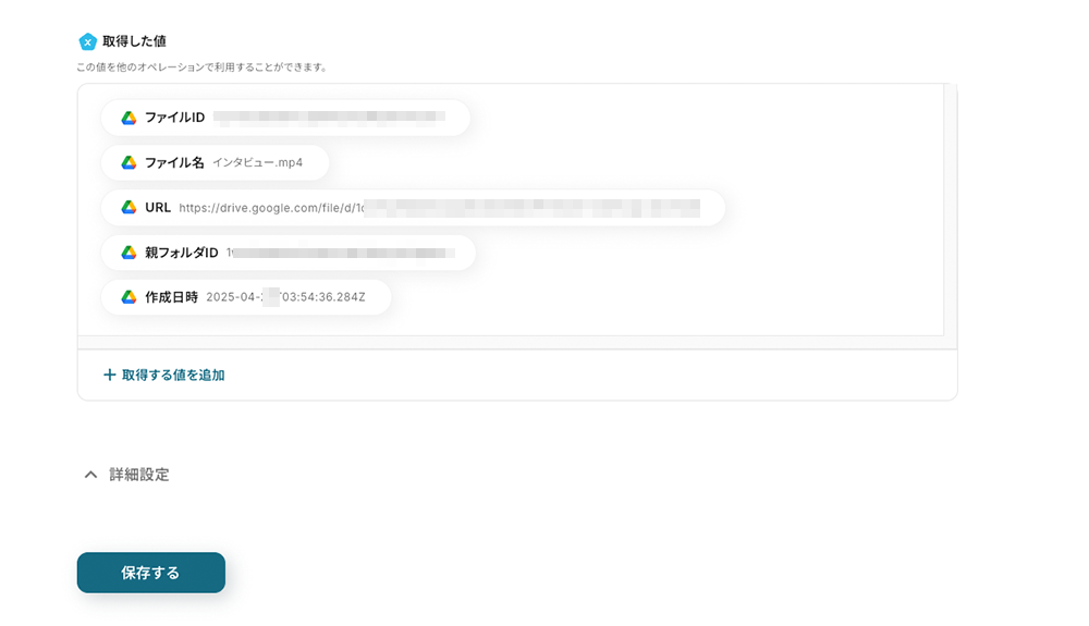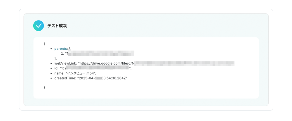 これは、正常にGoogle Driveからファイル情報が取得できたことが表されています。その結果、以下の項目・値が取得できます。