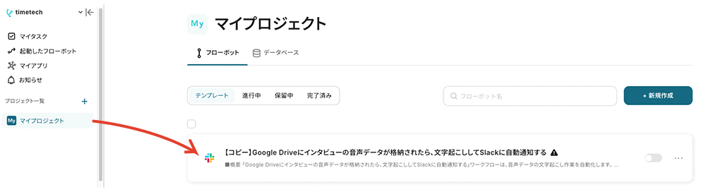 コピーしたテンプレートは、マイプロジェクトに追加されます。マイプロジェクトは左のメニューバーからアクセス可能です。