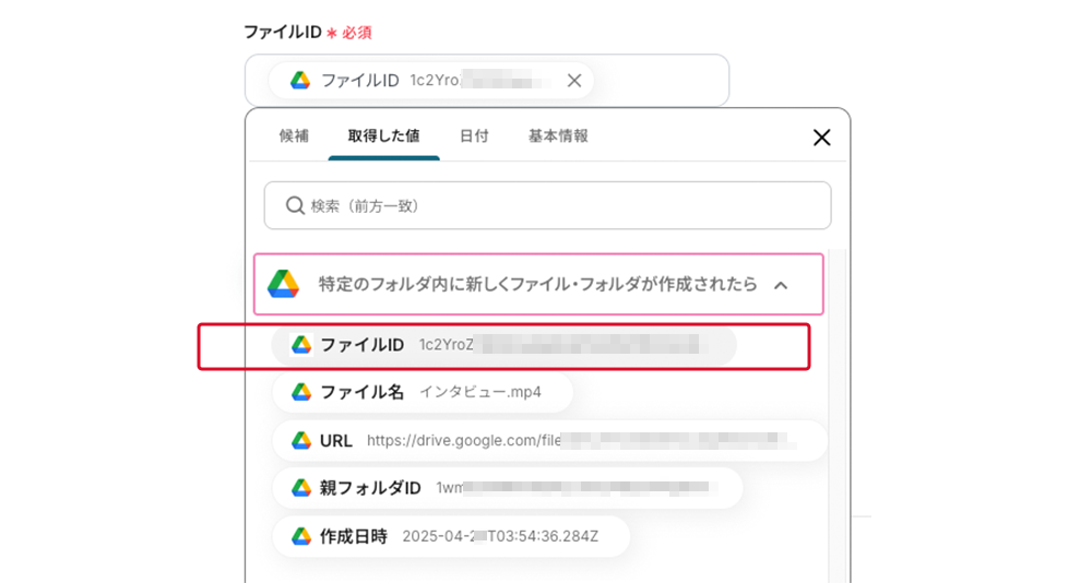 ファイルID 事前設定で、前の工程で取得した値の引用コードが埋め込まれていますので、追加操作は不要です。ちなみに、このコードは編集欄をクリックすると表示されるプルダウンメニュー内に格納されています。