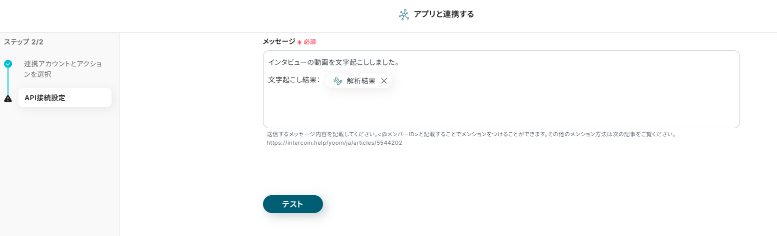 設定・編集ができたらテストボタンをクリック しましょう。成功すると、指定したチャンネルに文字起こしの内容が投稿されます。
