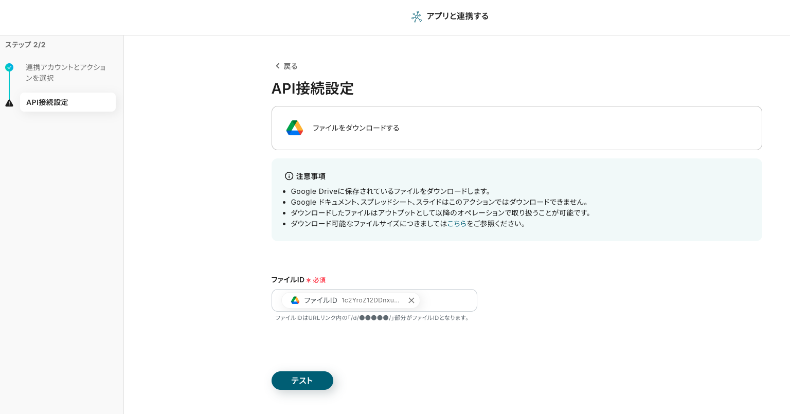 テンプレートの2つ目の工程をクリックします。この工程では、前の工程で取得したファイルIDを用いて音声データをダウンロードする設定を行います。