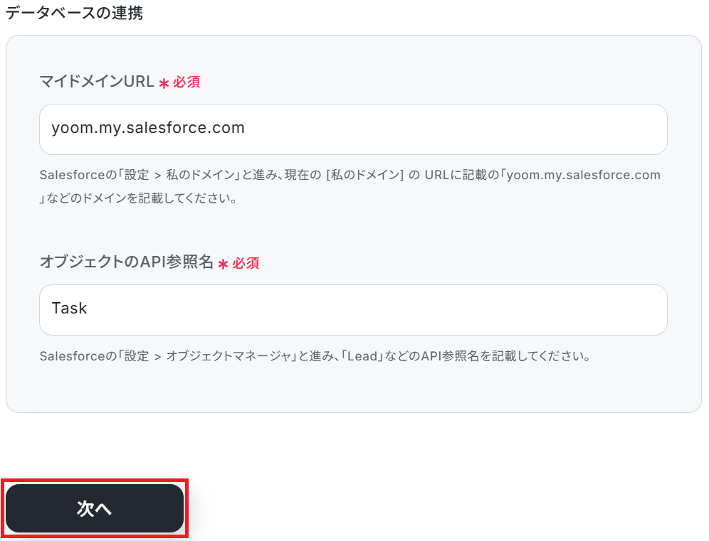 次に、テキストボックス下部の説明を参考にマイドメインURLとオブジェクトのAPI参照名を入力して「次へ」をクリックしましょう。今回は例として「Task」オブジェクトを使用します。