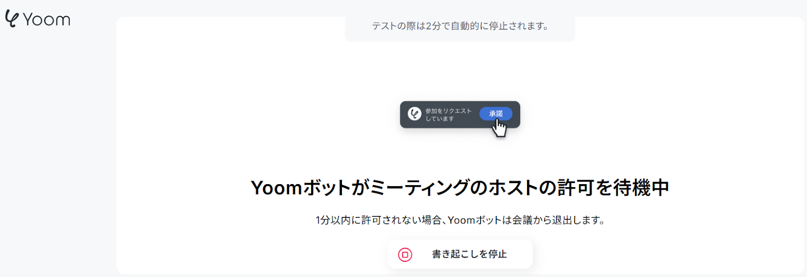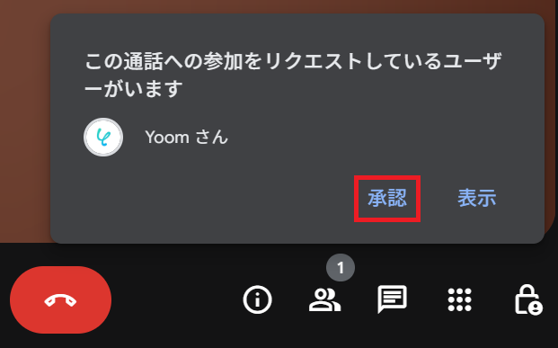 次に、先ほど発行したURLからZoomまたはGoogle Meetの会議を開始し、Yoomの参加を承認しましょう。