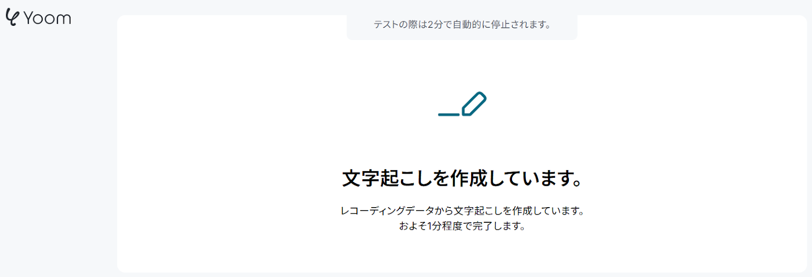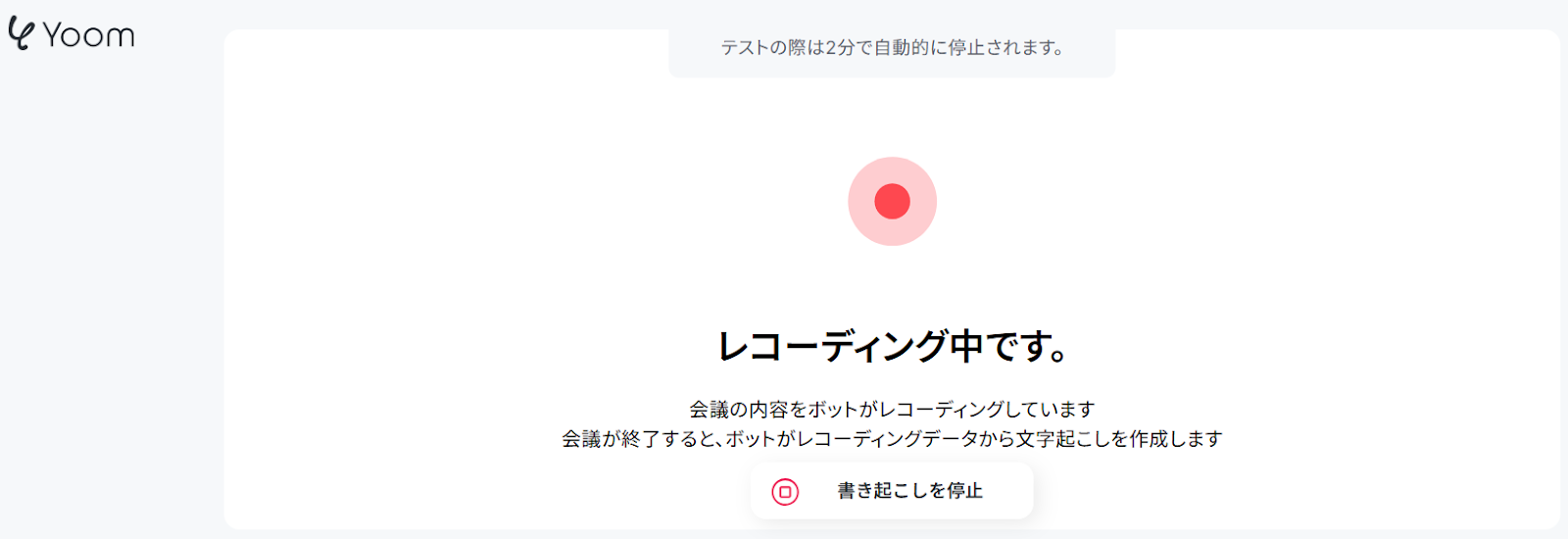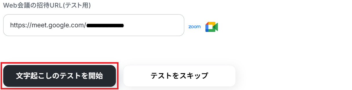 まずWeb会議の招待URL(テスト用)の欄に、先ほど発行したURLを入力して「文字起こしのテストを開始」をクリックしてください。
