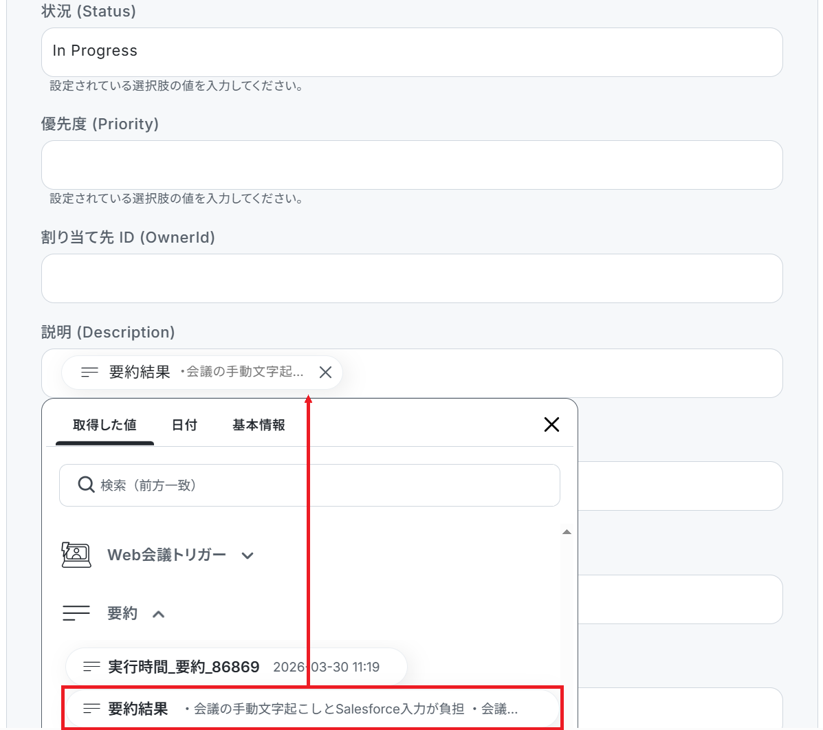 - また、前段のオペレーションで要約した会議の文字起こし内容など、動的に取得した値を変数として各項目に埋め込むこともできます