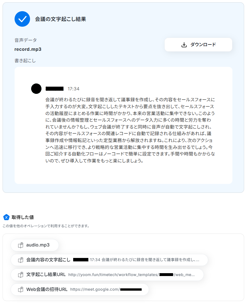 Web会議のたびに発生する文字起こしや、議事録の内容をSalesforceに手入力する作業は、時間もかかり重要な業務を圧迫することもあるのではないでしょうか。このワークフローは、Web会議が終了すると自動で音声の文字起こしを行い、内容をAIが要約した上でSalesforceに活動記録として追加するため、会議後の定型業務を効率化し、入力の手間やミスを減らすことが可能です。