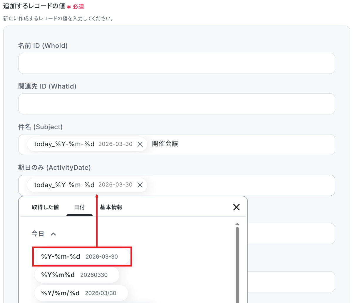 - Salesforceへレコードを追加するアクションでは、設定項目に「商談議事録」などの固定値を入力することが可能です