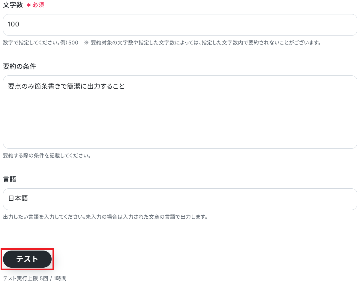 要約結果の文字数と、任意で要約の条件・言語を入力しテストしましょう。