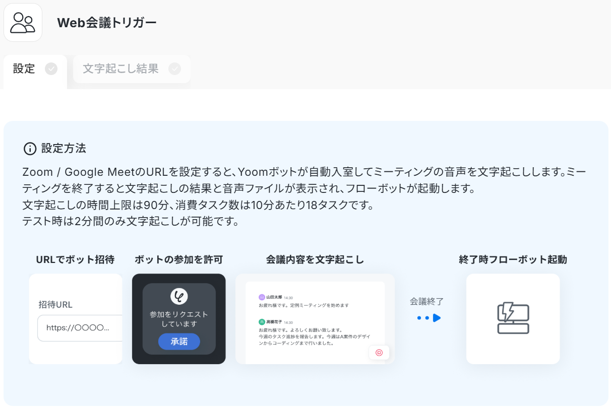 - Web会議トリガーの設定方法や注意点は「Web会議トリガーの設定方法」をご参照ください。