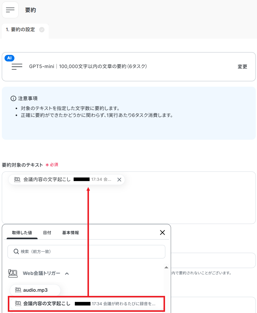 - 次に、オペレーションでAI機能の「要約する」を設定し、文字起こしされたテキストを要約します