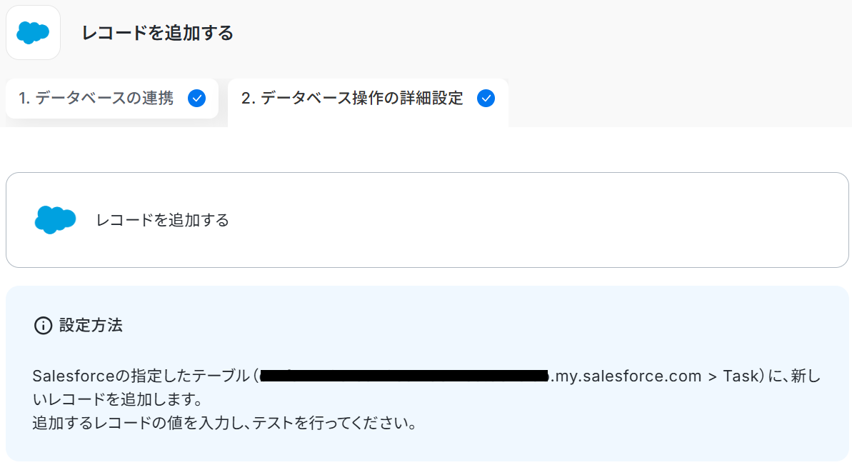 - 最後に、オペレーションでSalesforceの「レコードを追加する」を設定し、要約した内容などを活動記録として追加します