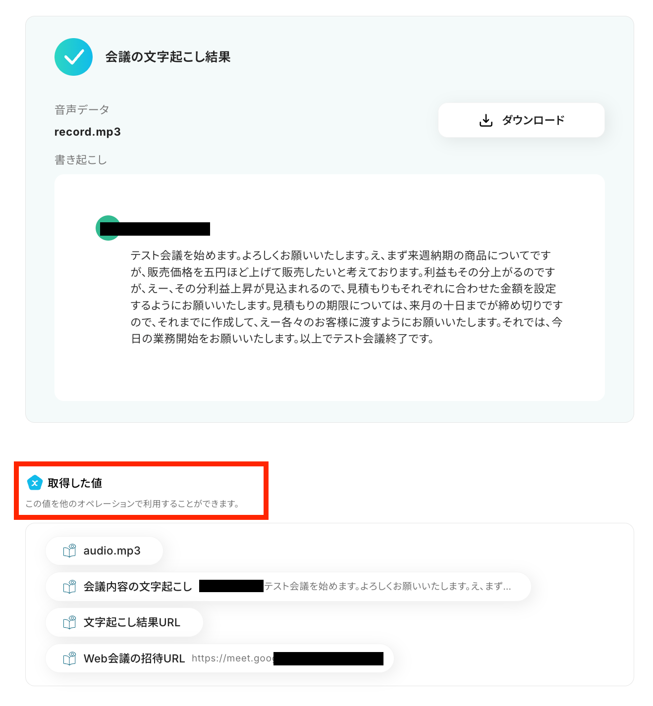 文字起こし結果と取得した値が確認できたら、「保存する」ボタンを押しておきましょう!