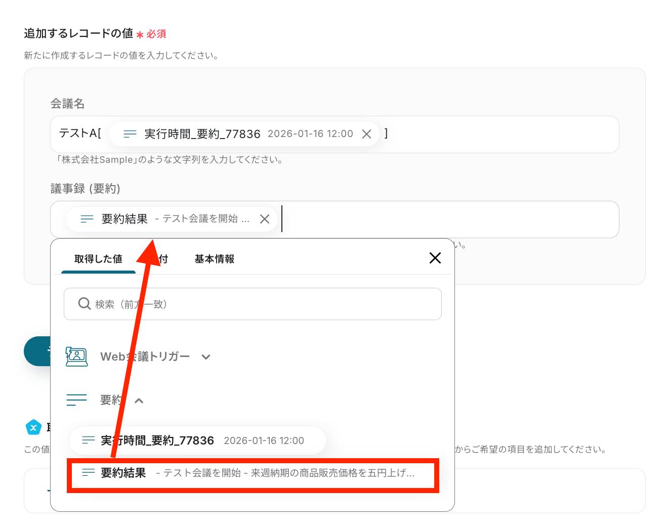 その後、「レコードを追加する」アクション部分で全文の部分に、取得した値から「会議内容の文字起こし」をマッピングしましょう。