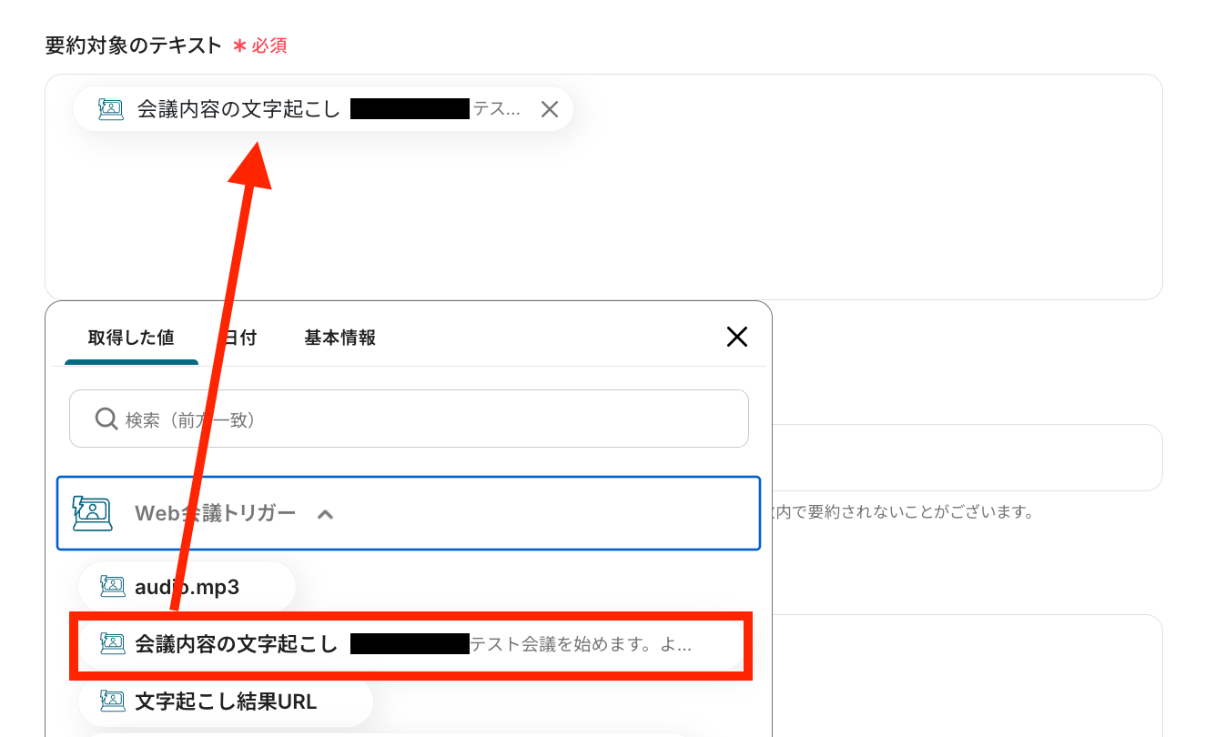 取得した値の中から、要約したい対象のテキストを選択します。