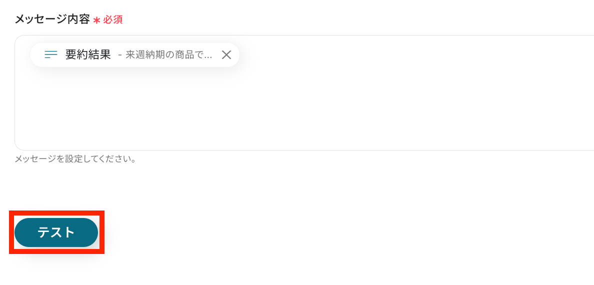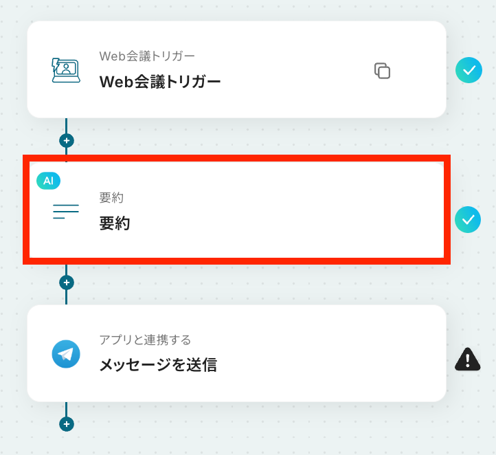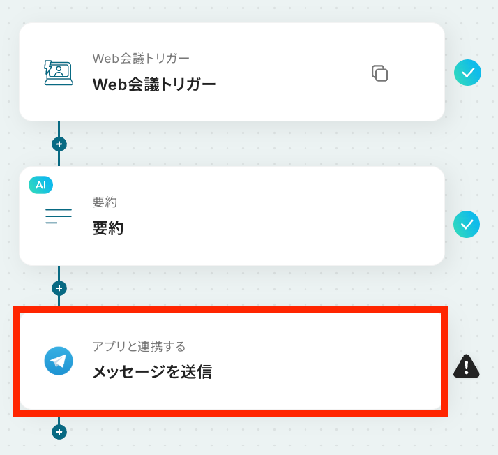 Web会議機能のトリガー設定では、自動化の対象としたい会議の招待URLを任意で設定できます AIによる要約オペレーションでは、文字起こしされたテキストを変数として使用し、独自の指示(プロンプト)を追加することで要約の条件を細かくカスタマイズすることが可能です Telegramへのメッセージ送信では、通知先のグループを任意に設定できるだけでなく、本文にAIが生成した要約などの変数を埋め込み、定型文と組み合わせた通知を作成できます ■注意事項