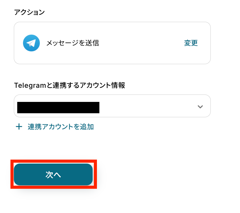 Telegramと連携するアカウント情報に間違いがないかを確認します。 アクションはテンプレートのままで問題ありません。次の設定へ移りましょう!