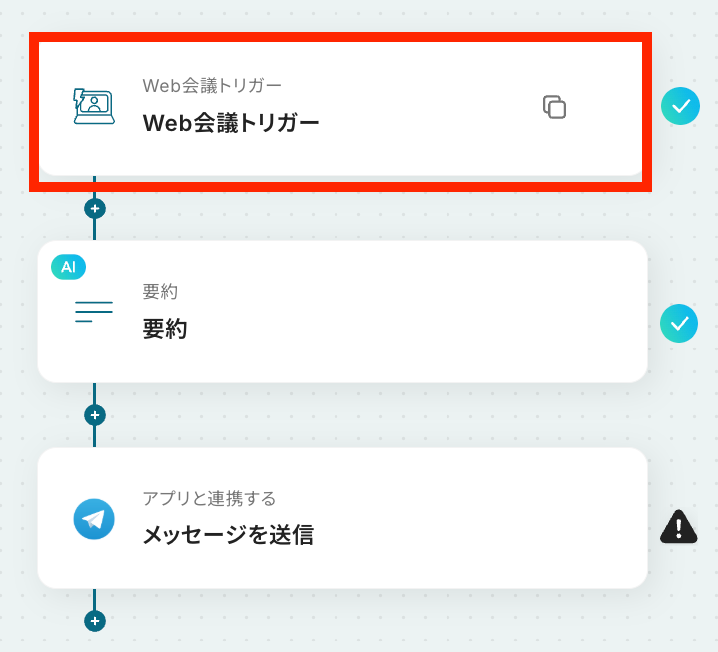 Web会議の文字起こし結果をTelegramで共有するフローを作ってみよう それではここから代表的な例として、Web会議が終了すると自動で文字起こしを行い、その要約をTelegramで共有するフローを解説していきます!