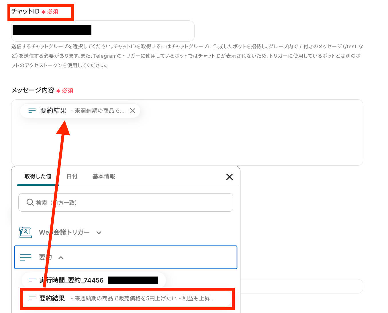 ステップ5:Telegramのアクション設定 これまでに取得した値を使用して、Telegramにメッセージを送信する設定を行います。