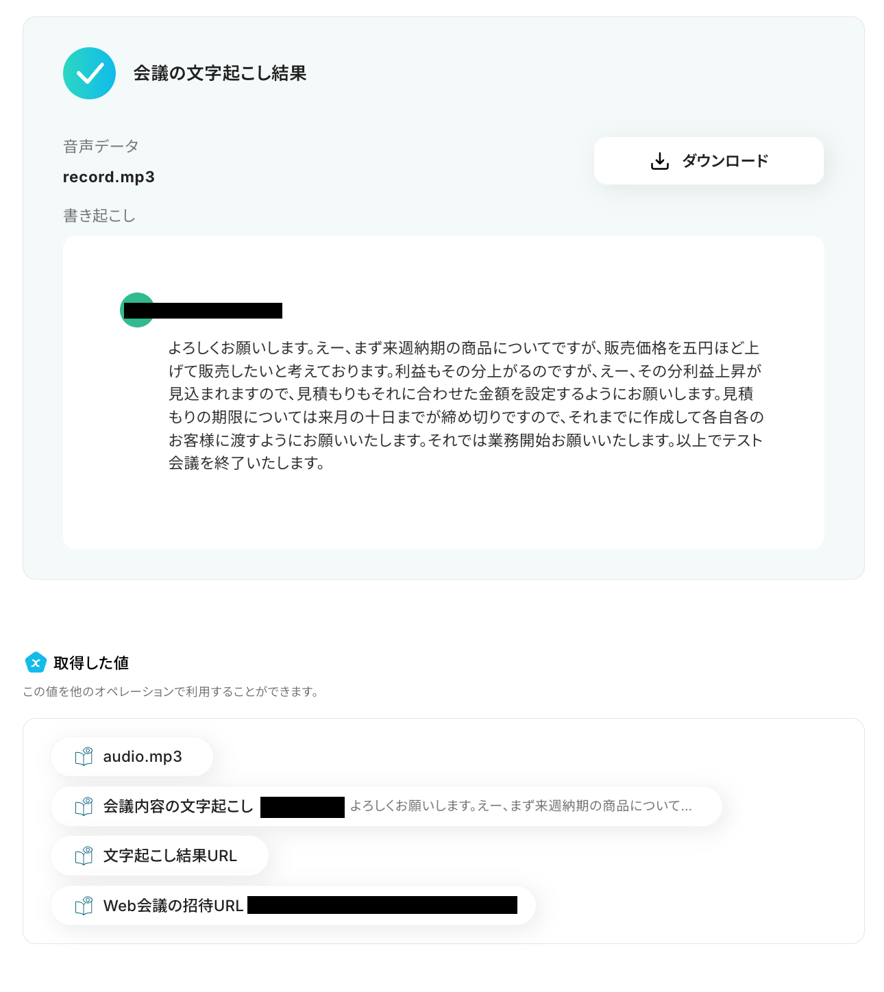 文字起こし結果と取得した値 が確認できたら、「保存する」ボタンを押しておきましょう!