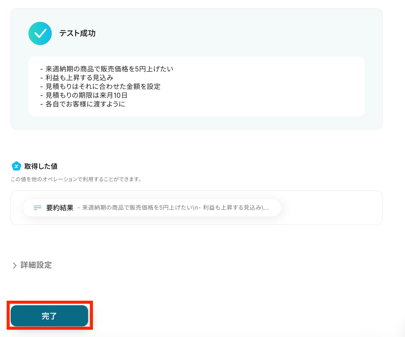 Salesforceへレコードを追加するアクションでは、設定項目に「商談議事録」などの固定値を入力することが可能です また、前段のオペレーションで要約した会議の文字起こし内容など、動的に取得した値を変数として各項目に埋め込むこともできます ■注意事項