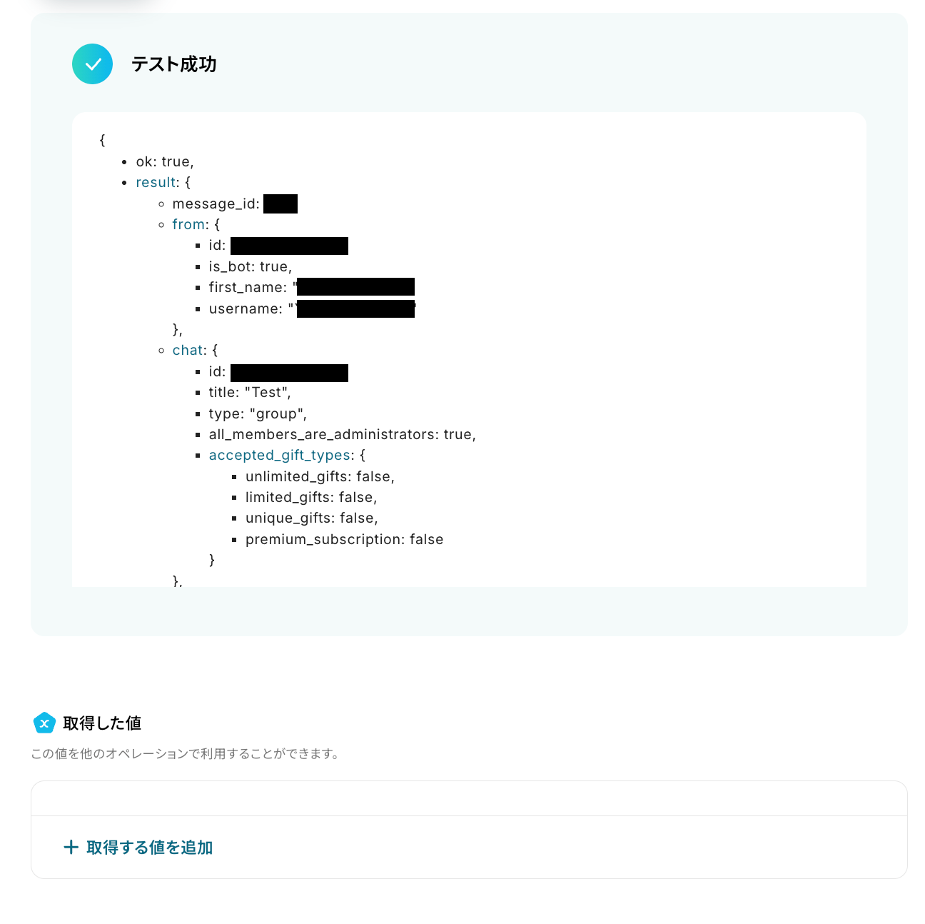 チャットIDをTelegramから確認して設定し、メッセージ内容を先ほど取得した値を活用して設定します。