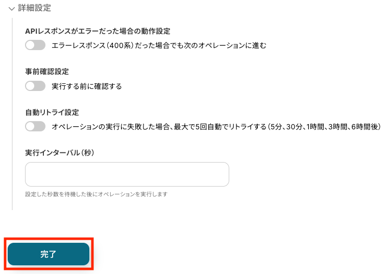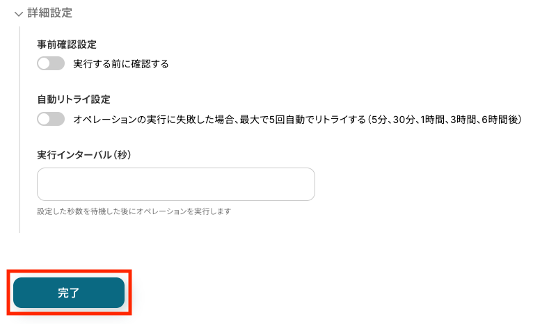 最後に、必要に応じて詳細設定を行い、「完了」をクリックしましょう。