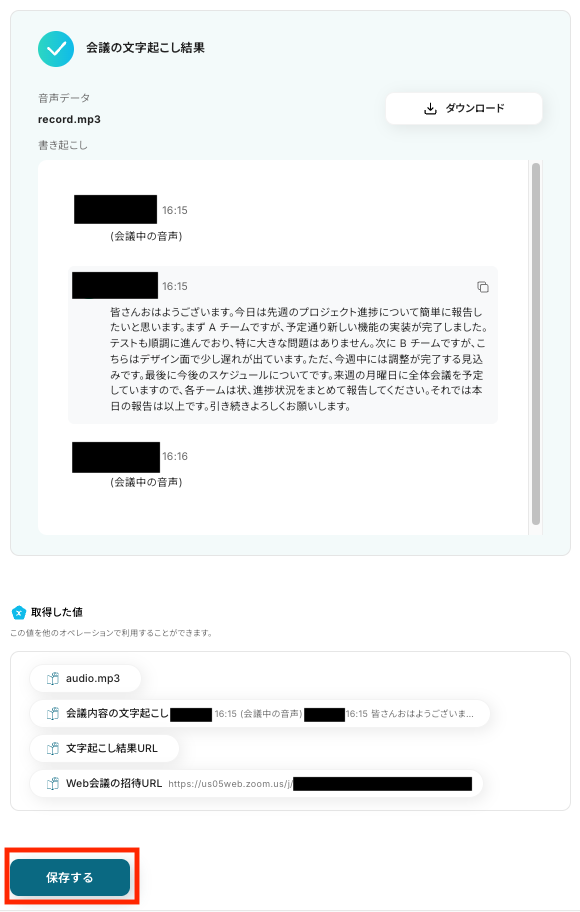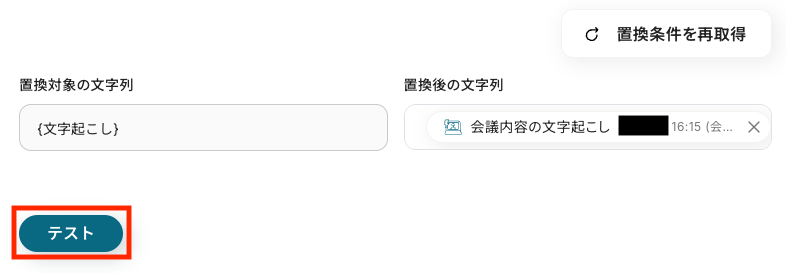 「置換後の文字列」には、ステップ3で取得した「会議内容の文字起こし」が自動で選択されています。