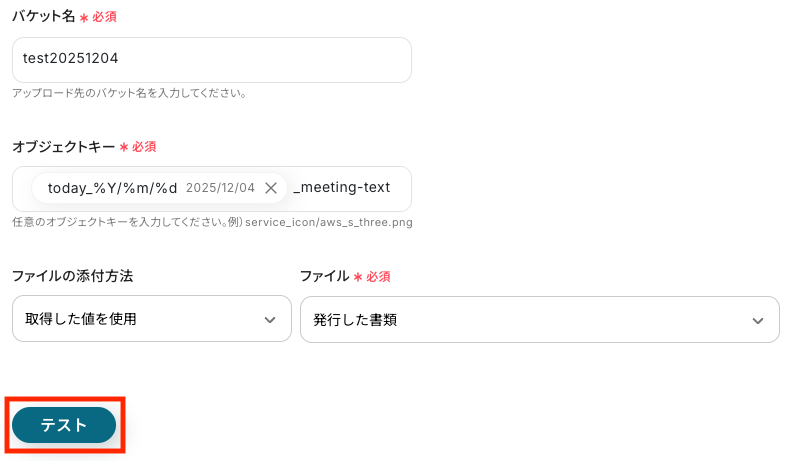 このステップでは、ステップ4で作成したPDFファイルをAmazon S3にアップロードする設定を行います。