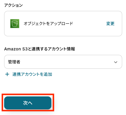 次に、Amazon S3のバケットにオブジェクトをアップロードする設定を行います。