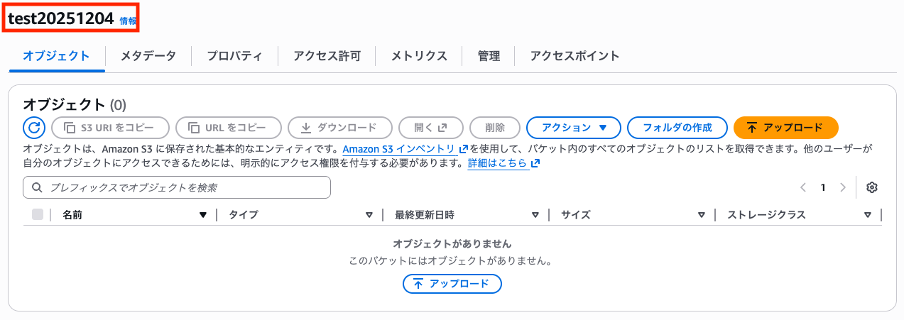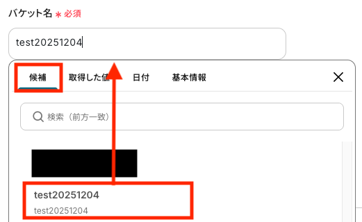 「バケット名」は入力欄をクリックすると候補が表示されるので、アップロード先のバケットを選択してください。