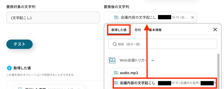 もし空欄になっている場合は、「置換後の文字列」の入力欄をクリックして「取得した値」タブを開き、「Web会議トリガー」の中から「会議内容の文字起こし」を選んでください。