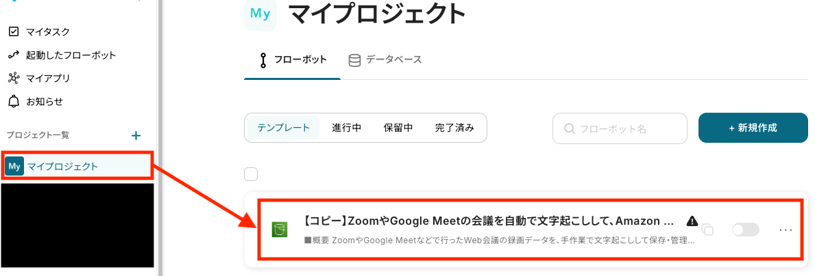 マイプロジェクトから、「【コピー】ZoomやGoogle Meetの会議を自動で文字起こしして、Amazon S3に保存」を選んでください。