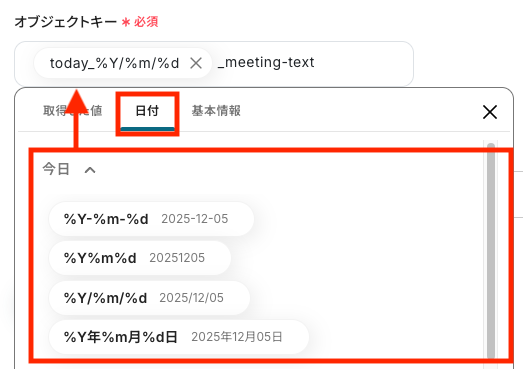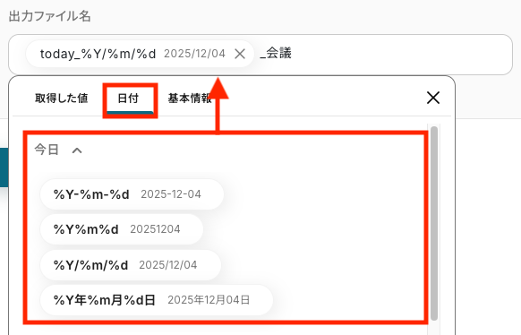 ここでは例として、日付と固定の文字列を組み合わせた「{今日の日付}_会議」という形式にしました。